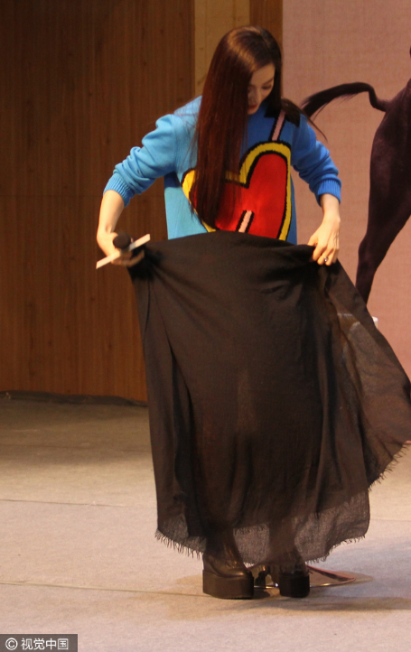 范冰冰為防止走光,用一塊黑紗蓋在腿上。