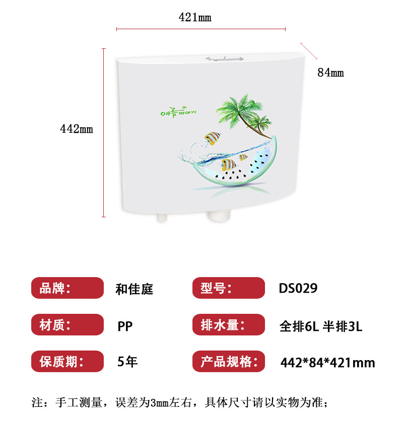 - 型 號:DS037 詠荷魚趣 產(chǎn)品尺寸:415*89*385mm 產(chǎn)品特點:3D面板,栩栩如生 產(chǎn)品功能:雙按鍵沖水箱 排 水 量:全排6升、半排3升